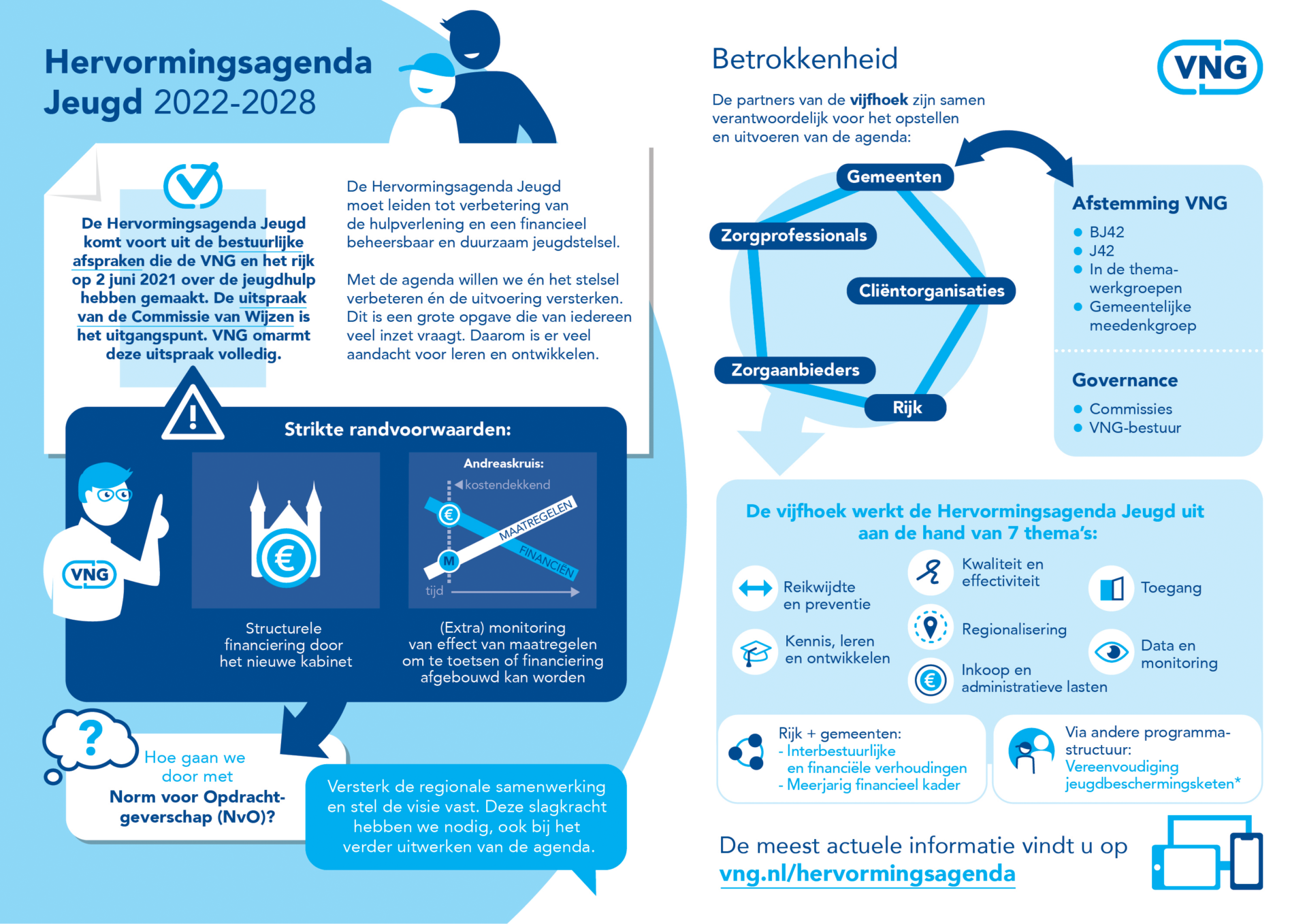 Het ministerie van VWS, zorgaanbieders, cliënten(vertegenwoordigers), professionals en de VNG stellen samen de Hervormingsagenda Jeugd op. Dit doen zij om de hulpverlening te verbeteren en het jeugdstelsel beter beheersbaar te maken. De 5 partijen werken de Hervormingsagenda uit aan de hand van thema’s.